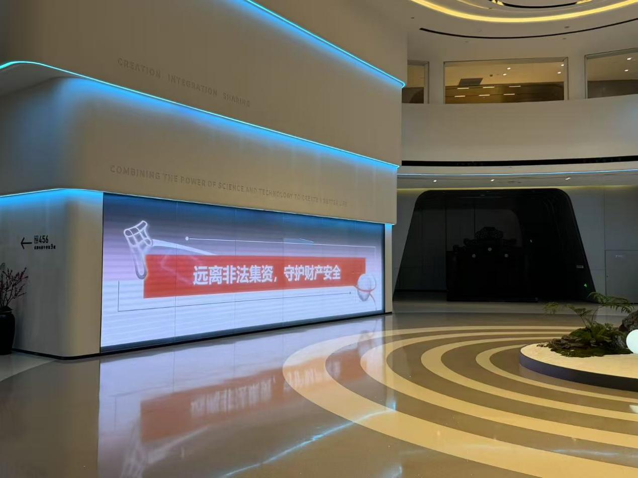 标语警示:公司青山湖园区办公大楼LED屏滚动播放“远离非法集资,守护财产安全”“高利诱惑是陷阱,理性投资保平安”等标语,强化警示效果。