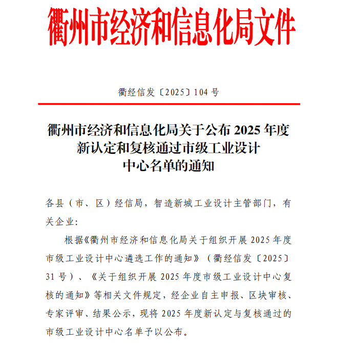 近日,衢州市经济和信息化局公布了2025年度新认定和复核通过市级工业设计中心的名单,根据《衢州市经济和信息化局关于组织开展2025年度市级工业设计中心遴选工作的通知》《关于组织开展2025年度市级工业设计中心复核的通知》等相关文件规定,经企业自主申报、区块审核、专家评审等一系列流程,浙江海纳半导体股份有限公司(以下简称“海纳股份”)成功通过衢州市2025年度市级工业设计中心复核。